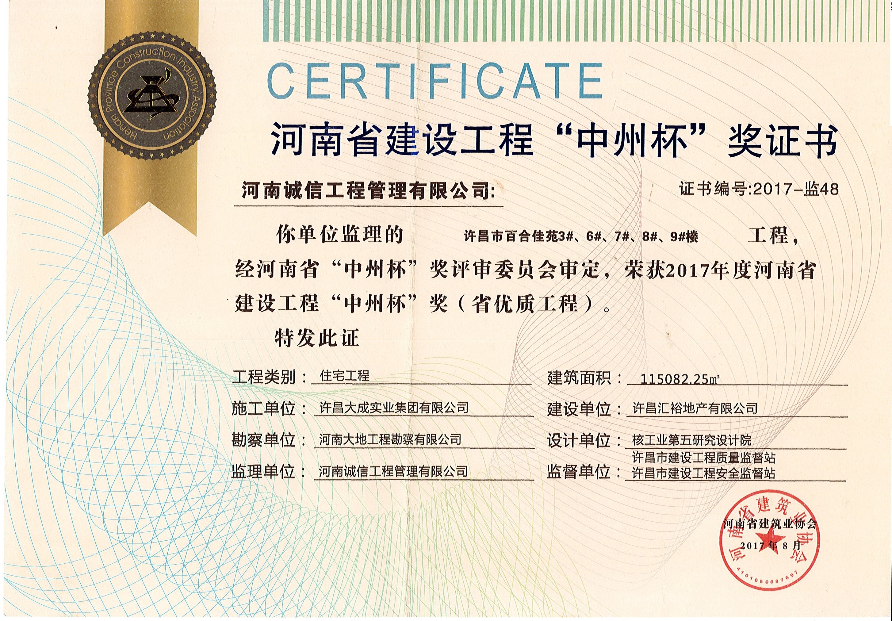 許昌市百合佳苑榮獲2017年度河南省建設工程“中洲杯”獎(省優(yōu)質工程)