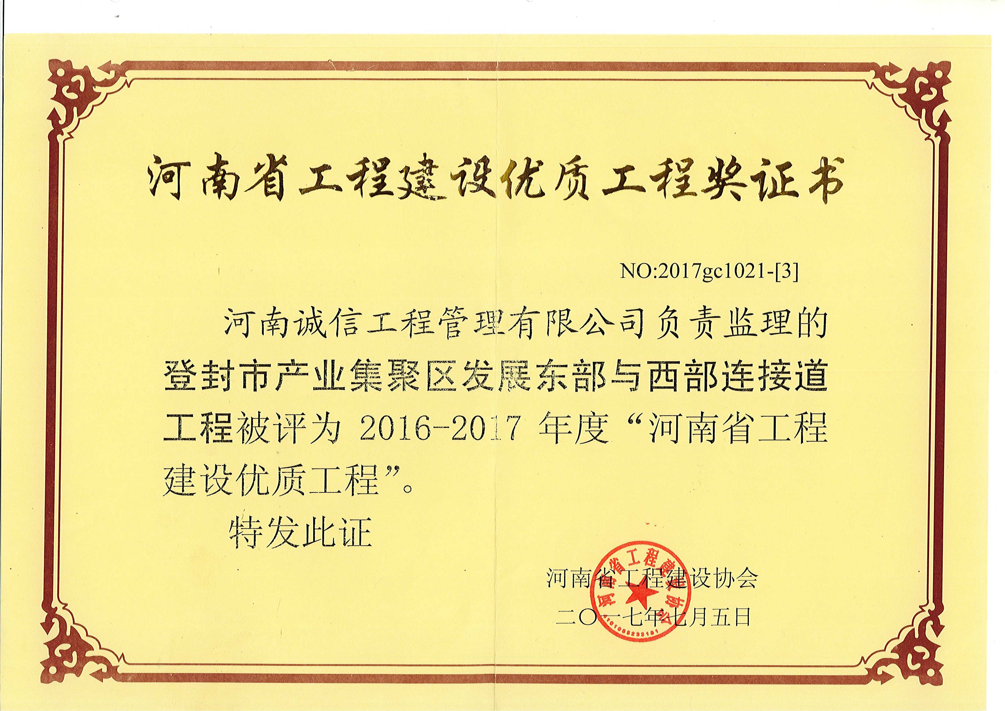登封市產業(yè)集聚發(fā)展東部與西部連接道工程榮獲2016-2017“河南省工程建設優(yōu)質工程”