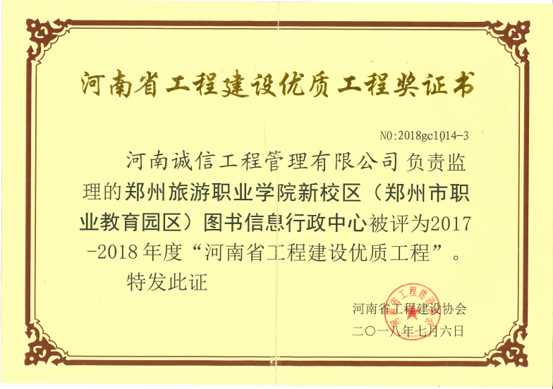 鄭州市旅游職業(yè)學院新校區(qū)圖書信息行政中心別評為2017-2018年度“河南省工程建設優(yōu)質工程”