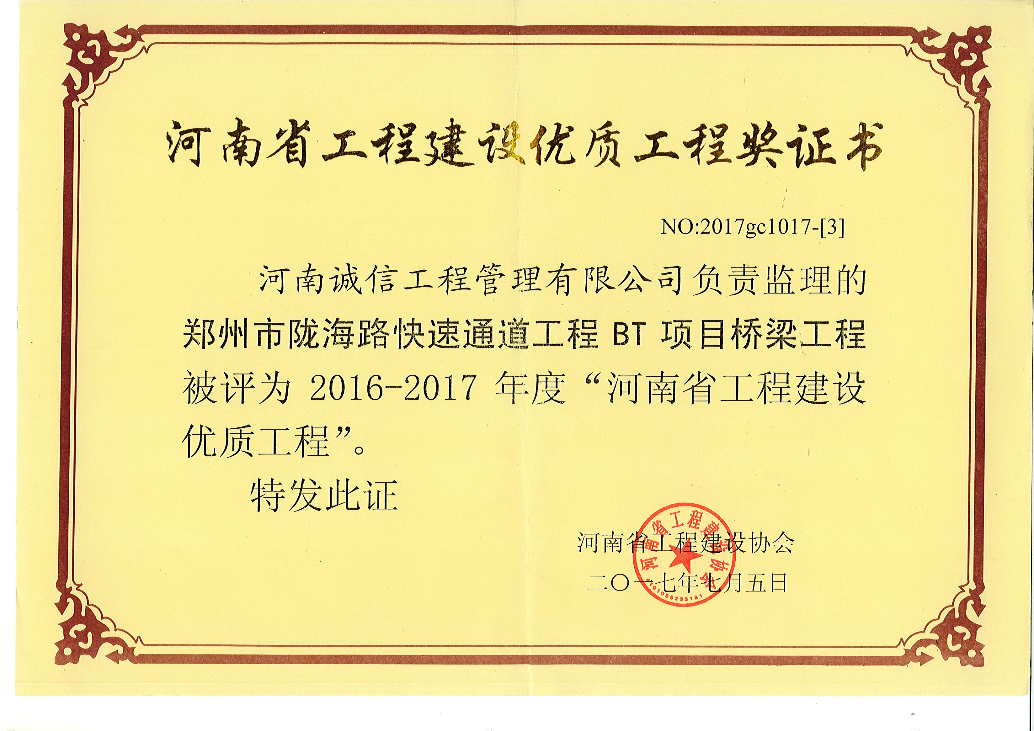 鄭州隴海路快速通道工程BT項目橋梁工程“榮獲2016-2017河南省工程建設優(yōu)質工程”