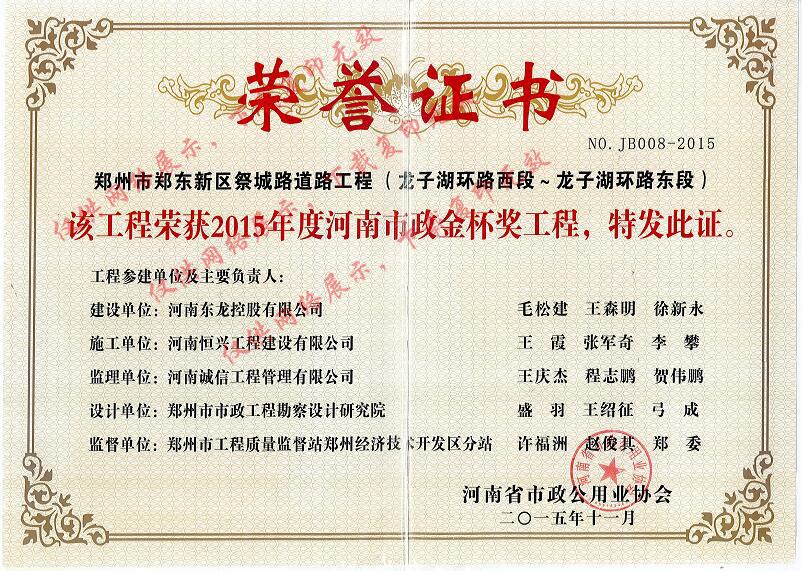 2015年鄭州市鄭東新區(qū)祭城路道路工程金杯獎(jiǎng)