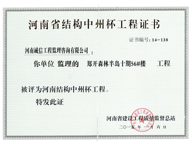 2015年開元壹號(hào)工程被評(píng)為“洛陽市優(yōu)質(zhì)結(jié)構(gòu)工程”