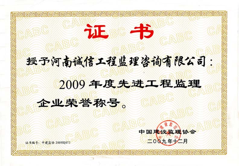 2009年度先進(jìn)工程監(jiān)理企業(yè)榮譽(yù)稱號(hào)
