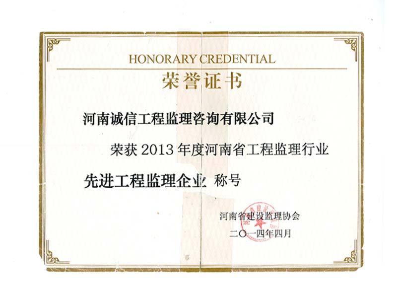 榮獲2013年度河南省工程監(jiān)理行業(yè)“先進(jìn)工程監(jiān)理企業(yè)”稱號(hào)